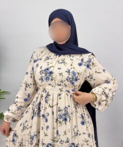 التفاصيل ديالو مدروسة بعناية، من الأكمام الطويلة الواسعة بشوية تجمع فالمعصم، حتى الخصر المحدد بلطف لي كيعطي شكل أنيق بدون ما يضيق. الطبقات الخفيفة فالتنورة كتعطيه حجم زوين وحضور مميز.